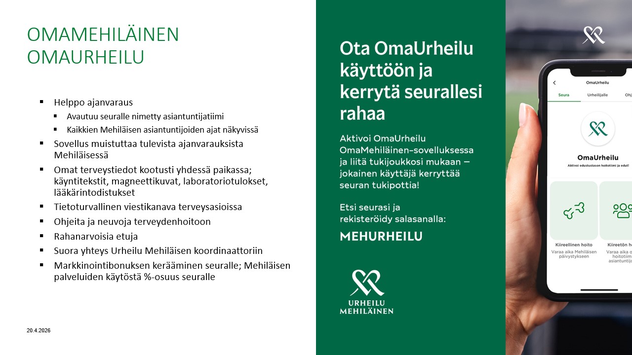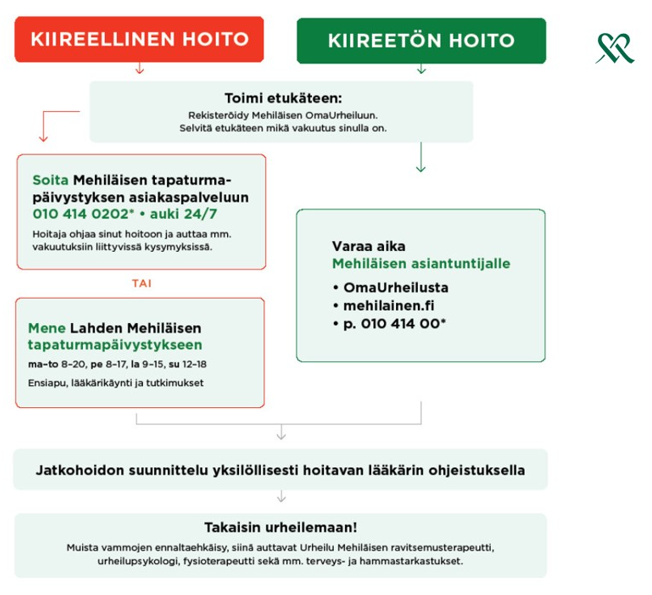 Urheilu Mehiläinen on Päijät-Hämeen Urheiluakatemian kumppani lääkäriasioissa. Jokaisella urheilijalla tulee olla tapaturmavakuutus, joka kattaa kilpailu- ja harjoittelutoiminnan, sekä niihin liittyvien matkojen yhteydessä tapahtuneet tapaturmat kotimaassa ja ulkomailla. Jos haluaa kattavamman vakuutusturvan sairaanhoitoon, voi hankkia vapaaehtoisen sairasvakuutuksen omalta vakuutusyhtiöltä.